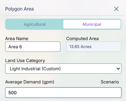 When a custom scenario is active, open the Properties Panel for any node, pipe, or area on the map. You will notice the input fields visually change: