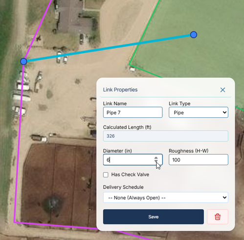 - In the Properties Panel, enter the Diameter (inches) and Roughness coefficient.