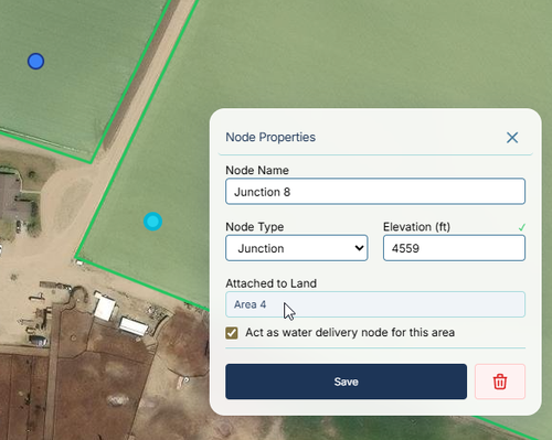 IAMDD automatically links water demand to a delivery point using spatial recognition. 1. Use the Draw Junction tool to place a single node directly inside the boundary of your agricultural area. 2. Because the node physically intersects the polygon, the engine automatically registers it as the delivery point for that field's crop water demand!