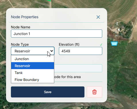 Every network requires at least one water source (an infinite-supply reservoir or a tank). 1. Click the Draw Junction tool in the left toolbar (it looks like a small dot with a circle). 2. Click on the map where your water source is located. 3. Switch back to the Pointer / Select Tool, and click on the node you just created. 4. In the right-hand Properties Panel, locate the Node Type dropdown and change it from Junction to Reservoir.
