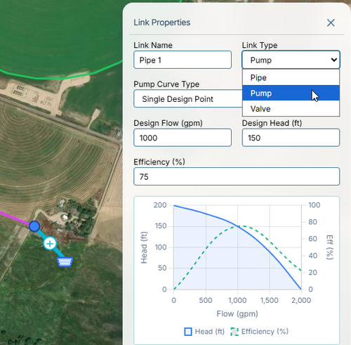 If your water source is not at a sufficiently high elevation to drive gravity flow, you will need a pump. 1. Select the pipe segment that immediately exits your water source. 2. In the Properties Panel, change the Link Type dropdown from Pipe to Pump. 3. The interface will immediately update to show pump parameters. Enter your desired Design Flow (gpm) and Design Head (ft) to generate a standard pump curve.