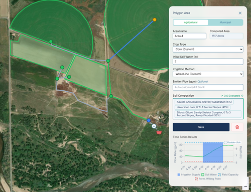 With the network fully drawn, you are ready to solve the hydraulics! 1. Click the green Run Simulation button (Play icon) in the top menu bar. 2. The engine will calculate crop demands, generate delivery schedules, and run the hydraulic solver across the entire simulation period. 3. Once complete, click on any Pipe to see flow and velocity plots in the side panel. 4. Click on any Node to view pressure trends. 5. Click on your Agricultural Area to view the dynamic Soil Water balance and Irrigation Delivery Rate plots.