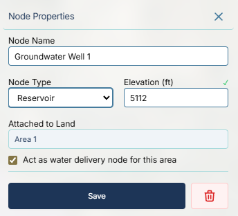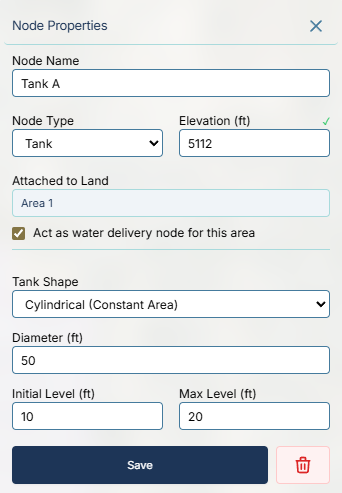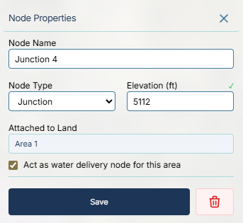 - Delivery Points: If you drop a junction inside (or near) a demand Area polygon, you can check the box for "Act as water delivery node for this area". The engine will extract water from the pipe network at this exact junction to satisfy the area's calculated demand, simulating the field's headgate or a neighborhood's main tap.