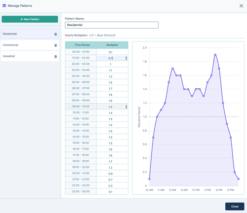 - Municipal Areas: Link a pattern to a municipal zone (e.g., Residential) to simulate peak morning showers and evening cooking demands.