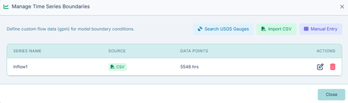 The Time Series Library allows you to import external, real-world data directly into your simulation. Currently, this library is strictly used to define dynamic Flow Boundary nodes, which allow you to force specific inflow or outflow rates at any given hour. This is incredibly useful for modeling historical events, simulating variable well outputs, or modeling large municipal diversions.