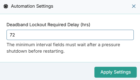 The Deadband Lockout Delay prevents this. It enforces a mandatory "cooling off" period. If a field shuts off (either because it finished its normal irrigation cycle, or because it was forced to shut down due to low pressure), it is strictly prohibited from turning back on until this many hours have passed.
