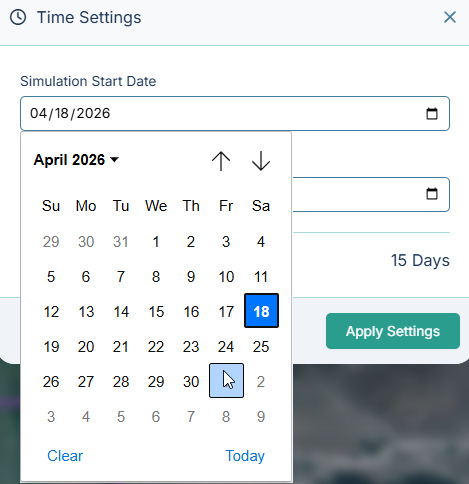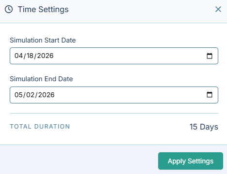 To change your simulation bounds, click the Settings > Time Settings option in the top navigation bar.